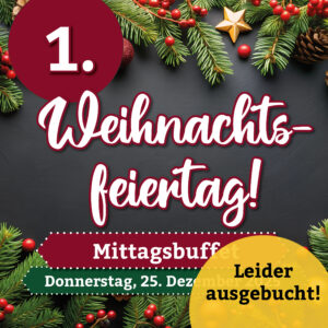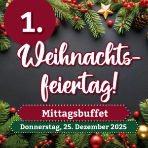 Die schönste Zeit des Jahres steht vor der Tür, und wir möchten euch herzlich zu unserem festlichen Weihnachts-Mittagsbuffet einladen! Lasst euch von festlicher Stimmung und köstlichen Leckereien verzaubern, während ihr mit Freunden und Familie zusammenkommt, um das Weihnachtsfest zu feiern. Am 1. Weihnachtsfeiertag (25.12.25) erwartet euch ab 11.30 Uhr ein reichhaltiges Buffet, das keine Wünsche […]