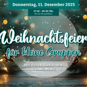 Ob Mannschaft oder Abteilungsfeier… Für Gruppen bis ca. 35 Personen haben wir ein tolles Angebot! Genießt am Freitag, den 28.11.2026 entspannt eure Weihnachtsfeier mit Freunden & Kollegen im Großmanns. Unser Angebot:  >>> Winterliches 3-Gang-Buffet  <<< Für nur 32,90 € pro Person Jetzt online Tickets sichern! Unser Menü: Kürbis-Kokos-Cremesuppe wahlweise mit Steierischem-Kürbiskernöl oder Chili-Öl *** Schnitzel […]